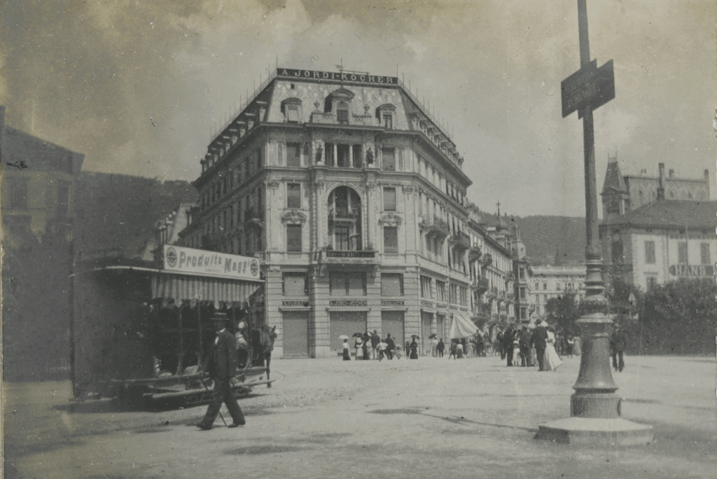 La Place centrale, fin du 19e – début du 20e siècle. Alignement des rues, candélabres, tramways. Une nouvelle modernité s’empare de Bienne, soumise à une forte croissance démographique. Fonds ETH. Libre de droits.