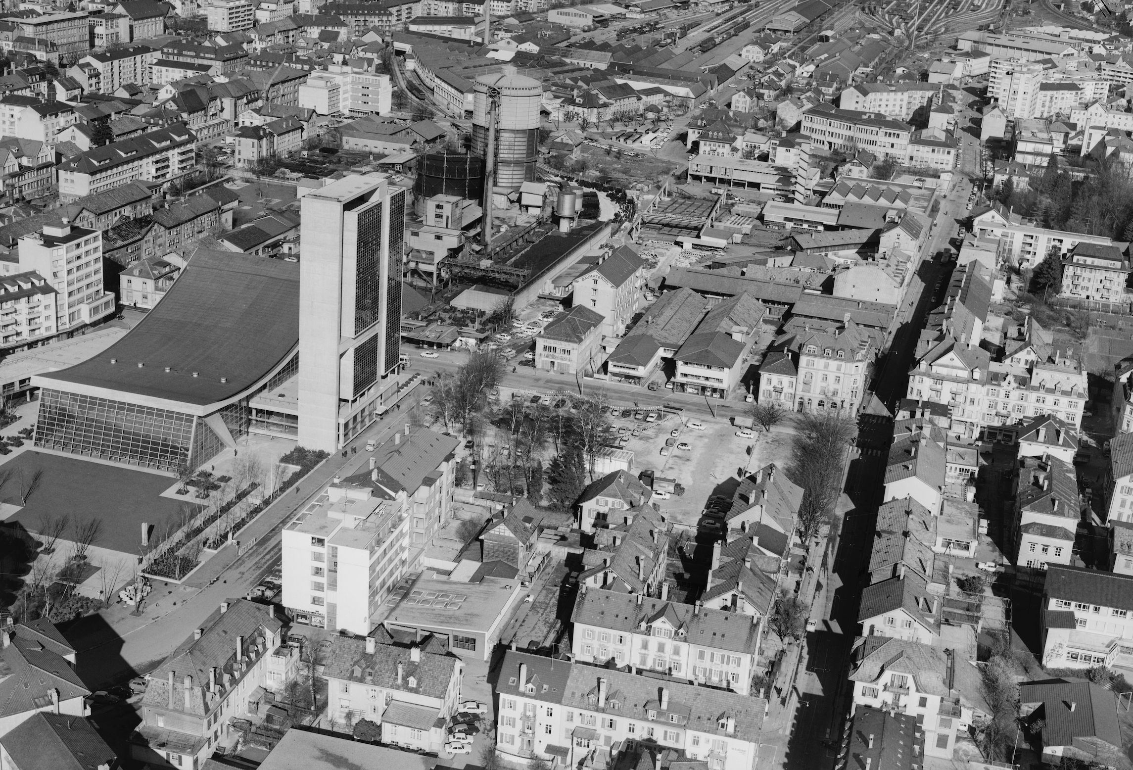 En 1967, deux époques côte à côte, de part et d’autre de la rue Centrale. Le Palais des Congrès, dont la construction est achevée en 1966 et l’usine à gaz, construite en 1862.