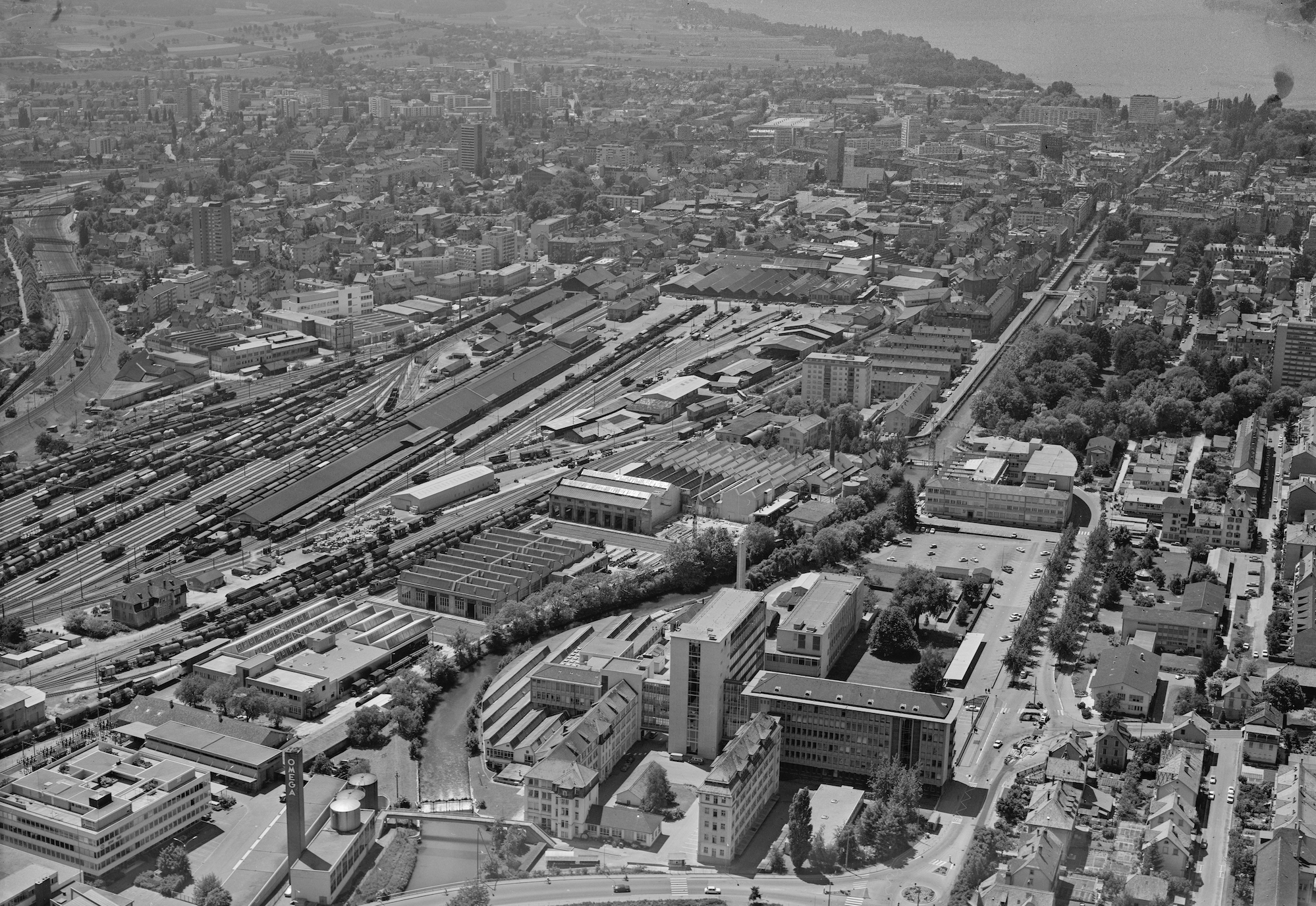 Vue aérienne de Bienne en 1970. Les entrepôts CFF et la manufacture de montres Omega, installée dès la fin du 19e siècle à la Rue Jakob-Stämpfli. Photographie Comet Photo AG (Zürich). Fonds ETH. Libre de droits.