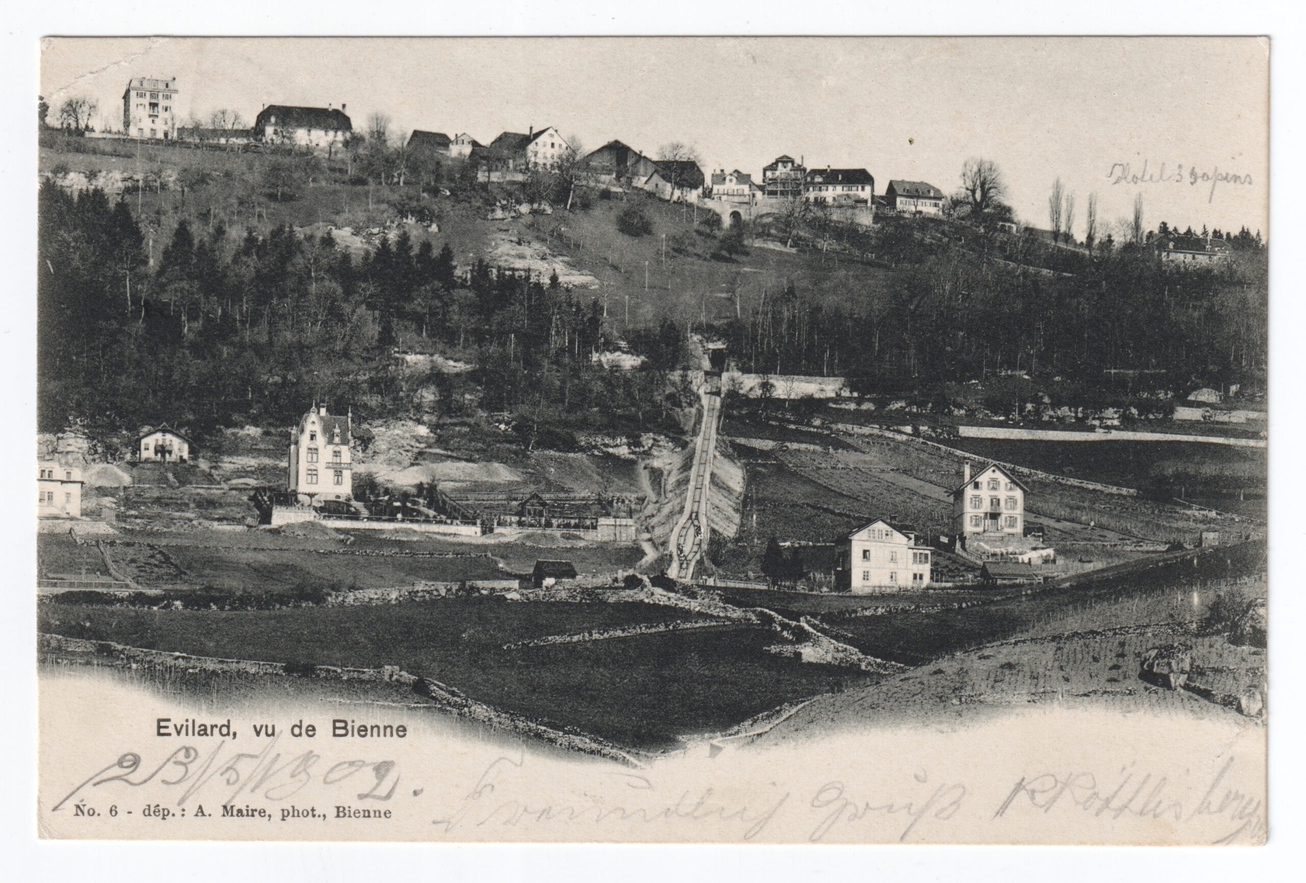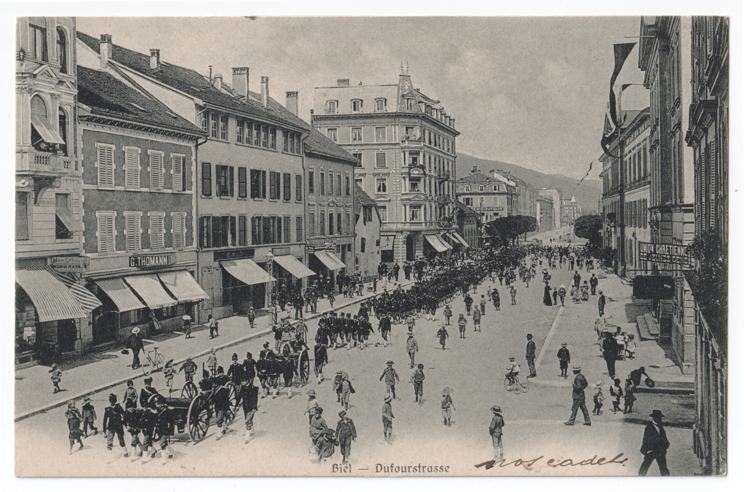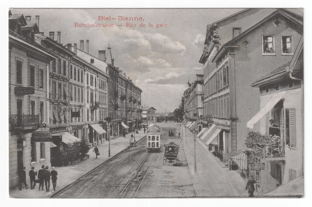 La Rue de la gare à Bienne en 1907. Au fond l’ancienne gare, détruite en 1923 et remplacée par la gare actuelle. Le tramway, qui fait son apparition à Bienne en 1877 symbolise la ville du 19e siècle et son étalement progressif. Carte postale de 1907. Collection Sikey.