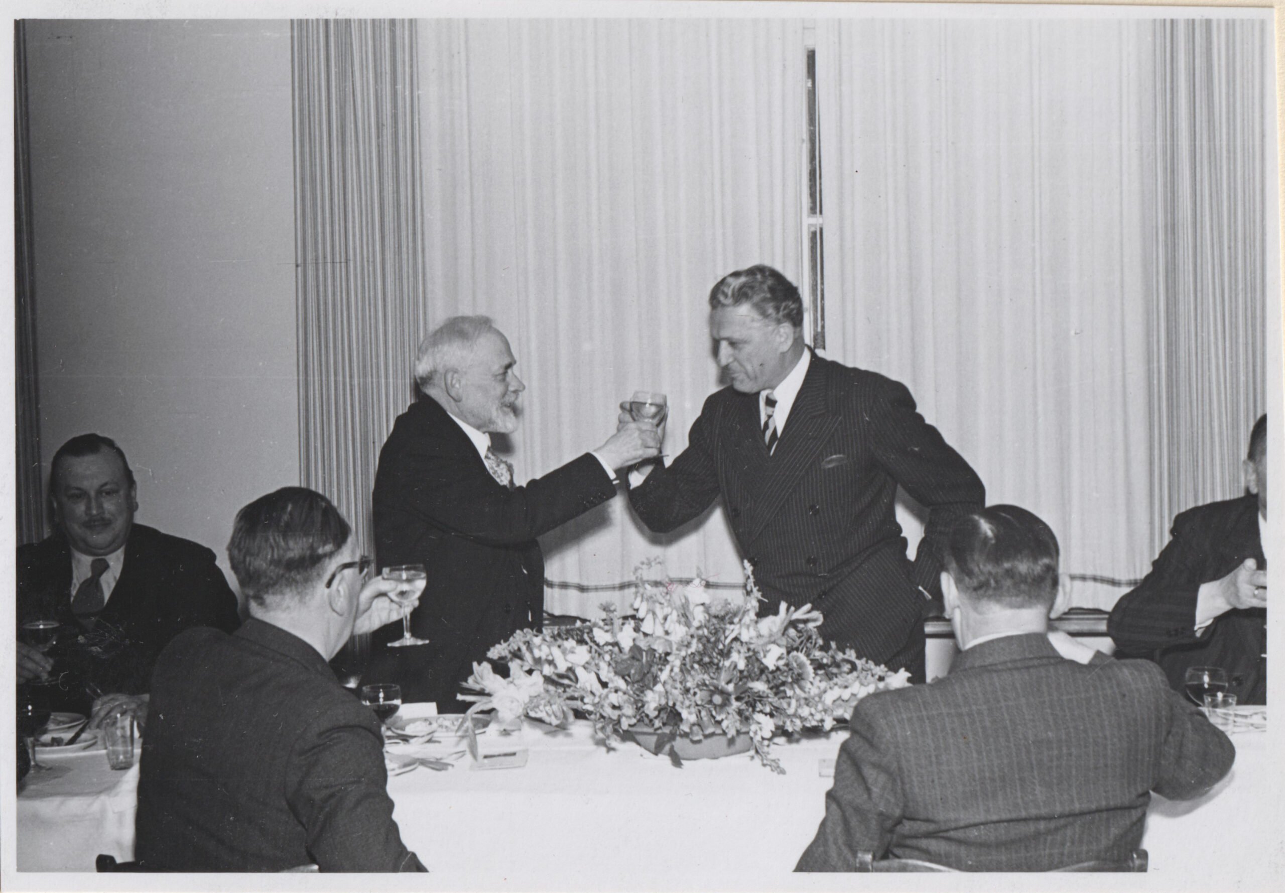 L’image d’une promotion économique ambitieuse. Le maire de Bienne, Guido Müller (à gauche) et le directeur de General Motors à Bienne, P.-R. Buergin, lors d’un repas offert par GM aux autorités municipales biennoises, le 17 juin 1947. Photographie Collection Sikey.