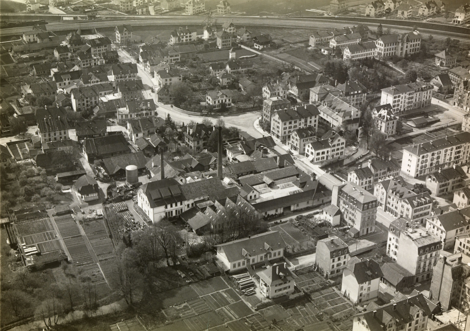 La fabrique de savon et détergeant des frères Schnyder à Madretsch vers 1930. Une industrie aujourd’hui disparue, qui fonctionna entre 1868 et 1991.Photographie Walter Mittelholzer. Fonds ETH. Libre de droits.