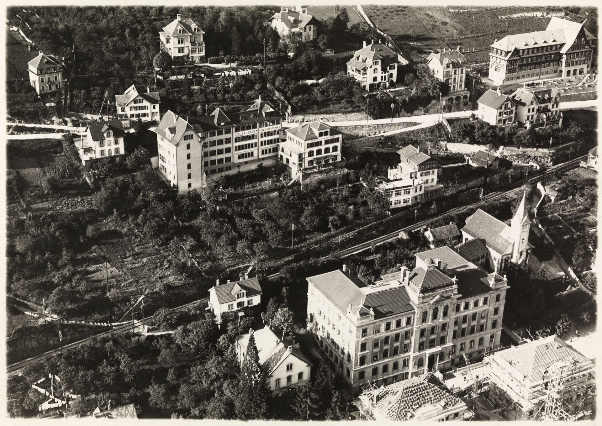 Symboles de la réussite horlogère de Bienne. Les bâtiments des manufactures Gruen et Aegler, qui fournissent les mouvement à Hans Wilsdorf, fondateur de Rolex. Entre 1918 et 1937. Photographie Walter Mittelholzer. Fonds ETH. Libre de droits.